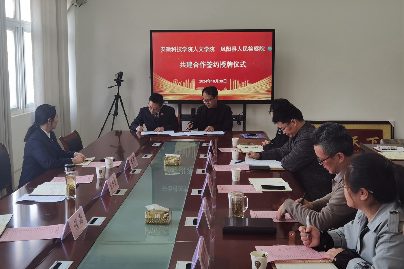10月30日下午,凤阳县人民检察院党组书记、检察长张杏喜,副检察长李艳、研究室主任程雨一行来校签署共建合作协议。人文学院党委副书记、院长李晓东,正处级组织员张严政,副院长牛永辉,党委副书记、纪委书记李沙娜,法学系主任张晓云,模拟法庭主任宣刚出席仪式。仪式由张严政主持。