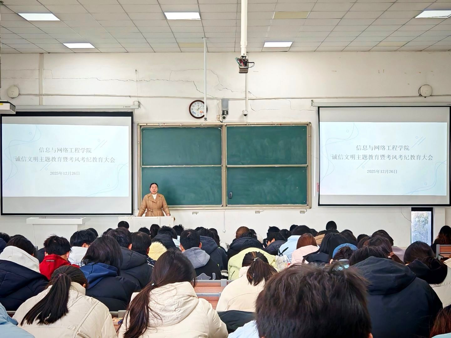 为夯实学院学风建设基础,营造公平公正的考试环境,12月26日中午,信息与网络工程学院在致知楼C111召开诚信文明主题教育暨考风考纪教育大会。学院党委副书记韦乃学及全体新生辅导员出席本次大会,2025级全体班委和学生会全体成员参加,会议由韦乃学主持。