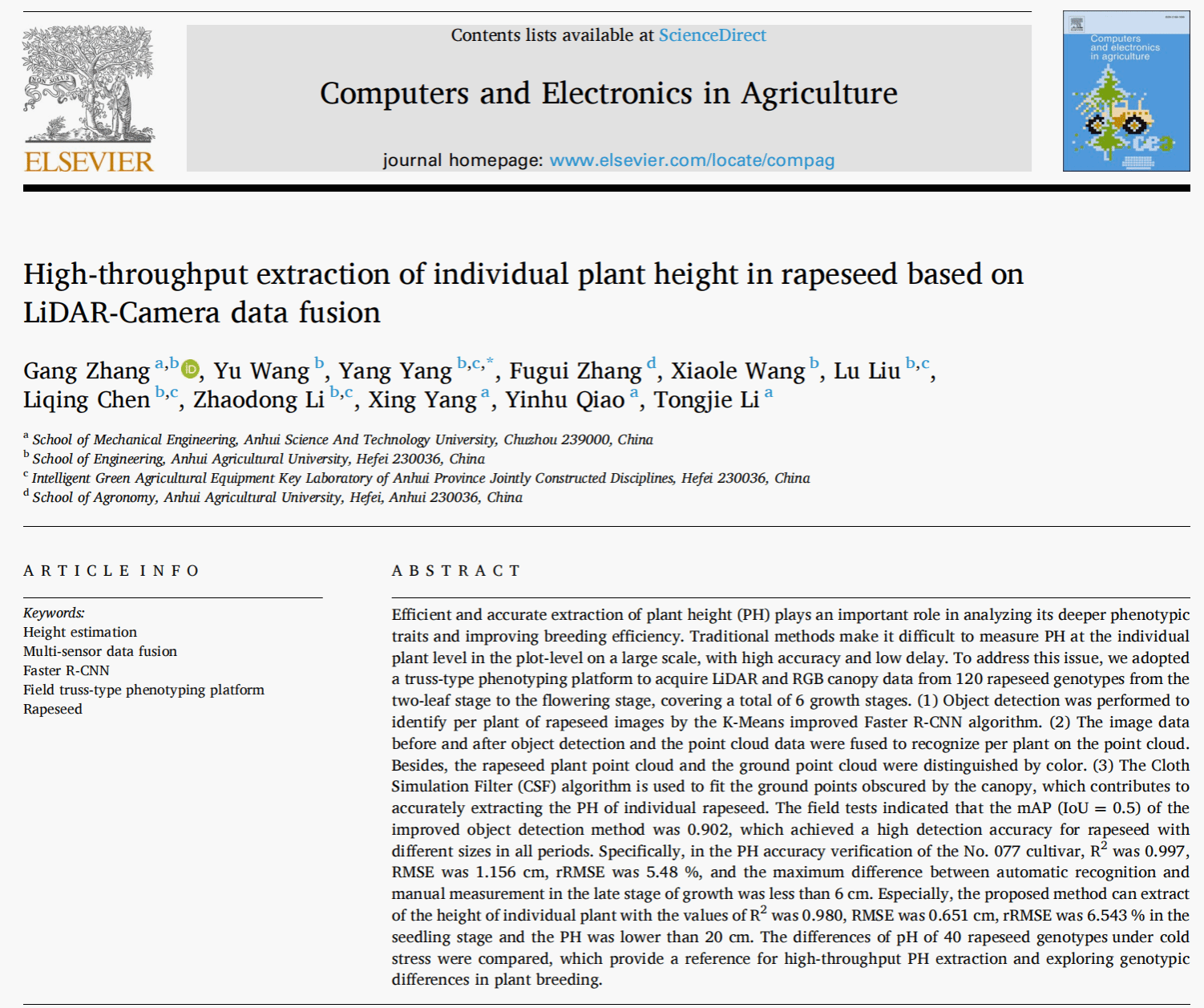 近日,我校智能制造学院教师张刚(第一单位/第一作者)在国际学术期刊《Computers and Electronics in Agriculture》(中科院1区TOP期刊(农林科学),IF:7.367)上发表了题为《High-throughput extraction of individual plant height in rapeseed based on LiDAR-Camera data fusion》的研究论文。该研究提出了一种基于雷达与相机数据融合的高通量油菜个体株高提取方法,实现了从两叶期至开花期多生长阶段下油菜株高的精准、高效测量,为作物育种表型分析提供了可靠的技术支撑。合作单位为安徽农业大学,研究得到了国家自然科学基金(32372003)、安徽省教育厅优秀青年人才项目(2022AH030090)、安徽科技学院横向科研项目(881709)等资助。