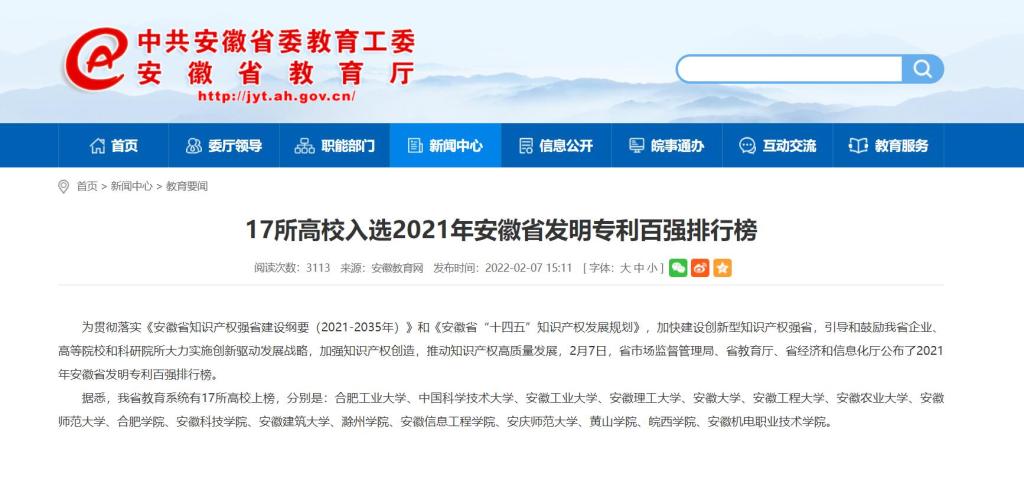2月7日,安徽省市场监督管理局、省教育厅、省经济和信息化厅联合发文公布了2021年安徽省发明专利百强排行榜,我校综合排名全省第45位,位列全省高校第10位,与2020年排行榜名次相同。这是自2015年安徽省首次发布发明专利百强榜以来,安徽科技学院第六次上榜。