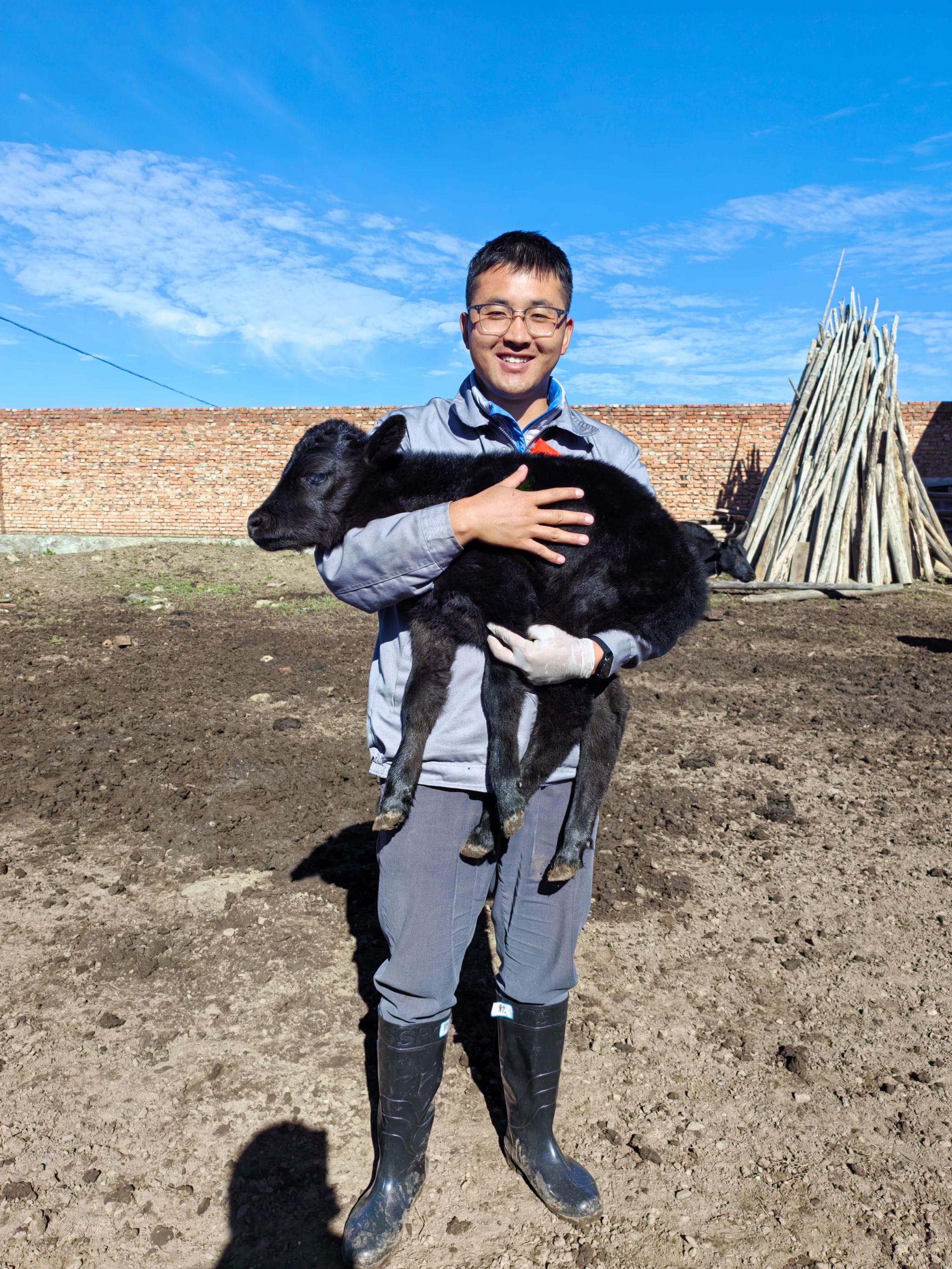 王军乾正在开展初生期犊牛的护理工作和孕牛血液样品的采集工作