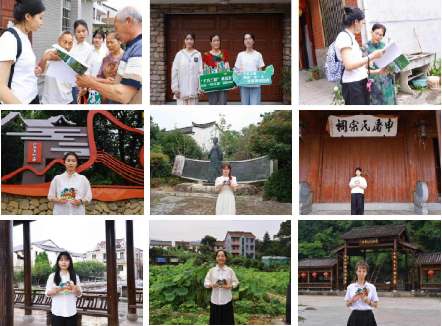 在实践调研中,成员们通过与当地居民实地交流,亲身体验民俗民风,沉浸式感受感受乡土风情,溯源乡村文化,策划了《正是江南好风景》“浙里”乡村推介宣讲,六位团队成员化身“乡村推介官”,将调研中感受到的荻浦村孝义文化、深澳村申屠氏优良家风文化、徐畈村和合文化、环溪村清莲文化以及青源村山水生态理念通过宣讲的方式进行传递与弘扬,做古村落的声音的倾听者与传播者,吸引更多游客走进“江南五村”落来亲身体会古村落的魅力。